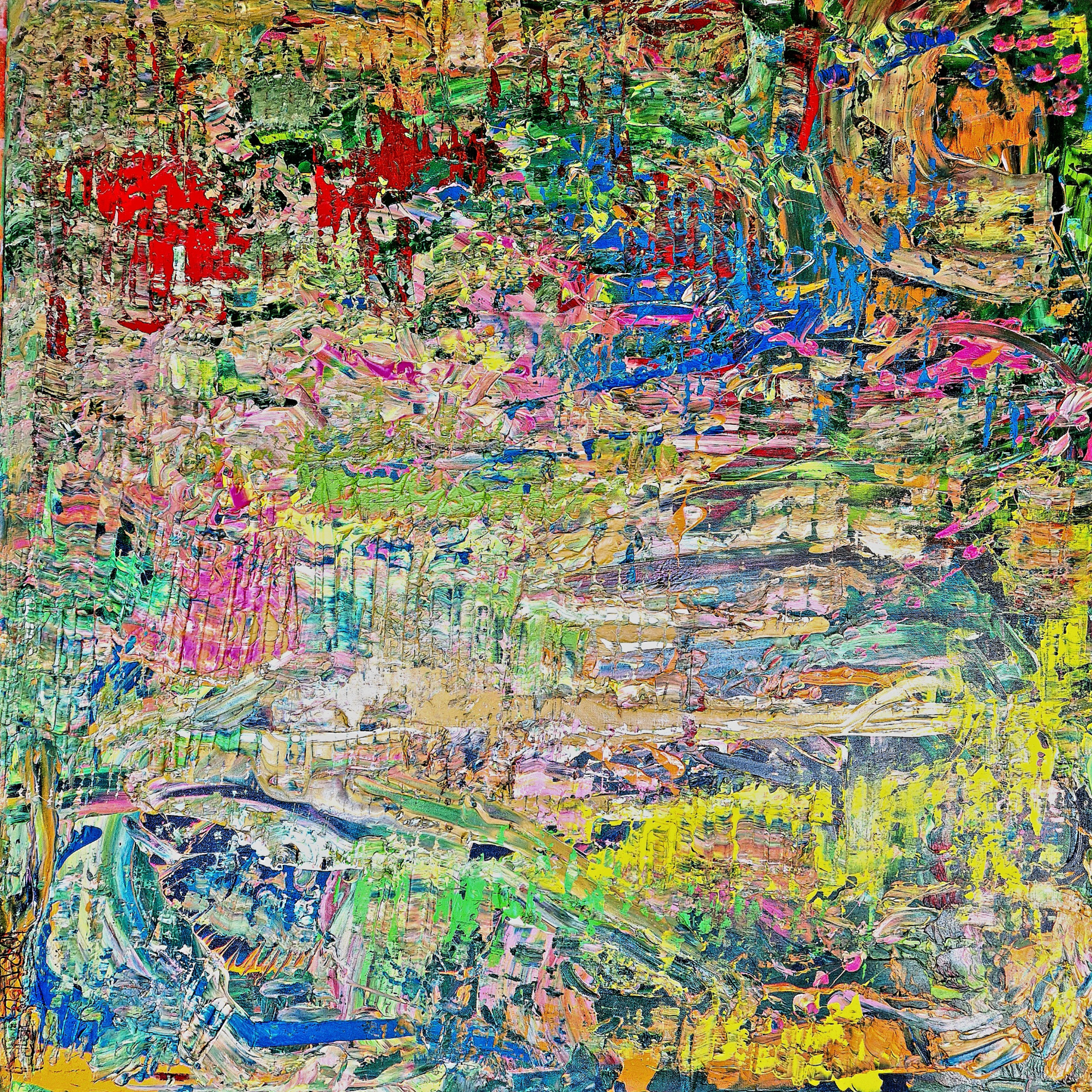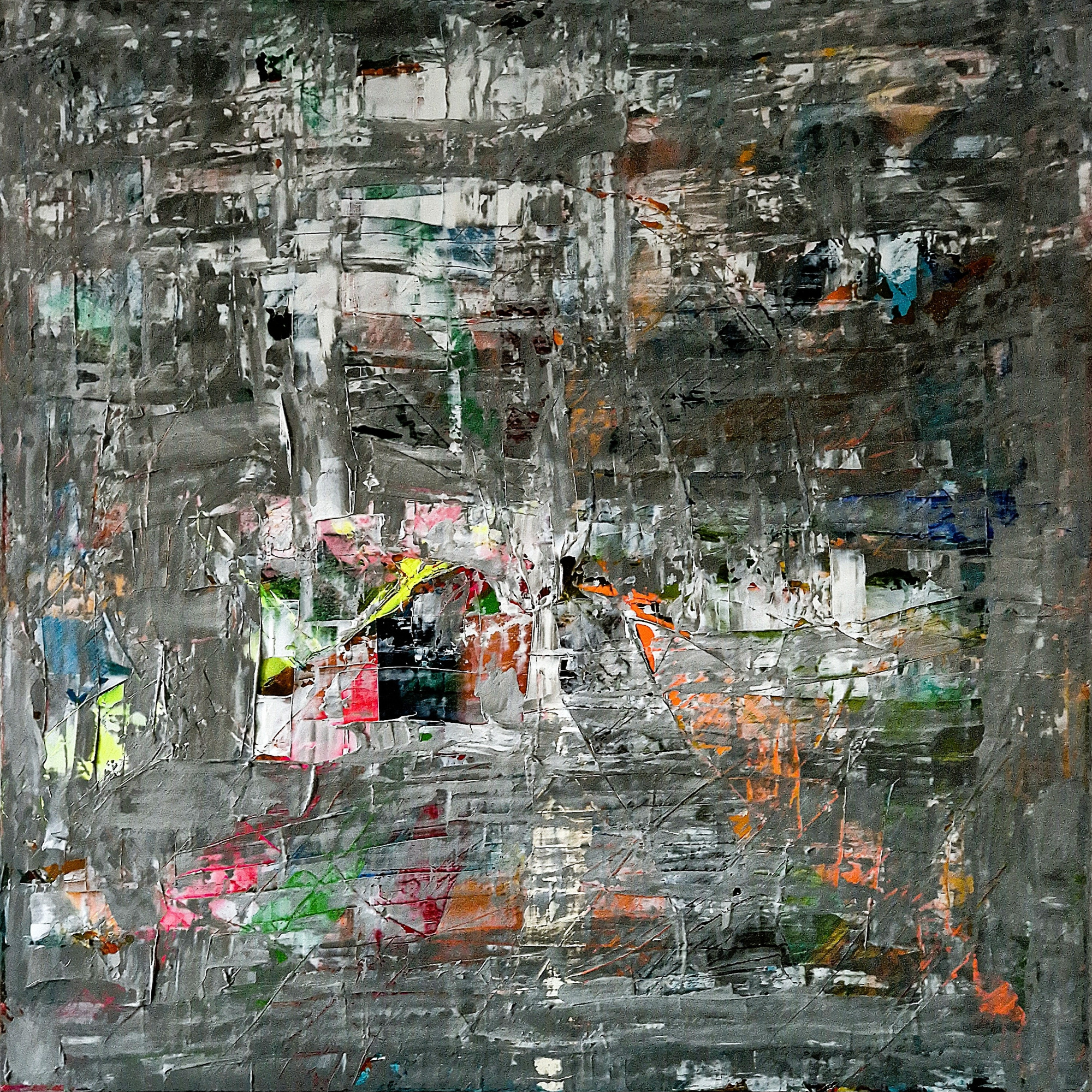 Eindrücke. Das Früher wird überlagert, teils bis es kaum noch erkennbar ist, oder schimmert nur noch in Fragmenten durch. Ältere Ebenen treten erneut hervor, anfängliche Kompositionen werden verändert. So entstehen neue Formen und Anregungen, bis schließlich jene kreative Spannung erreicht ist, die das Werk vollendet.